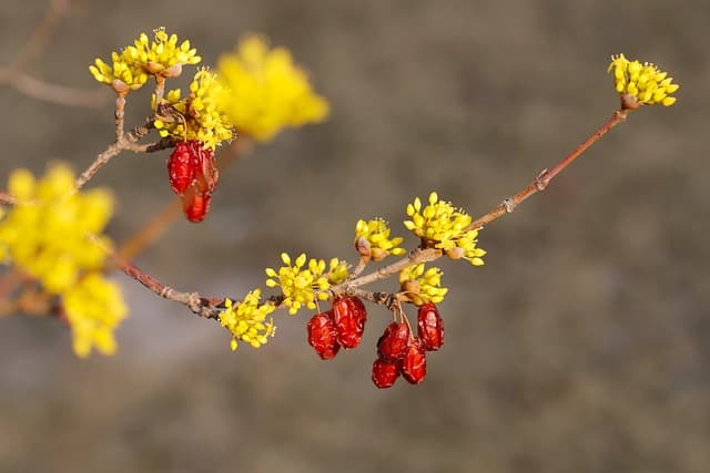 | 열매 | 붉은 산수유 열매(한약재) | 타원형의 검붉은 열매 |